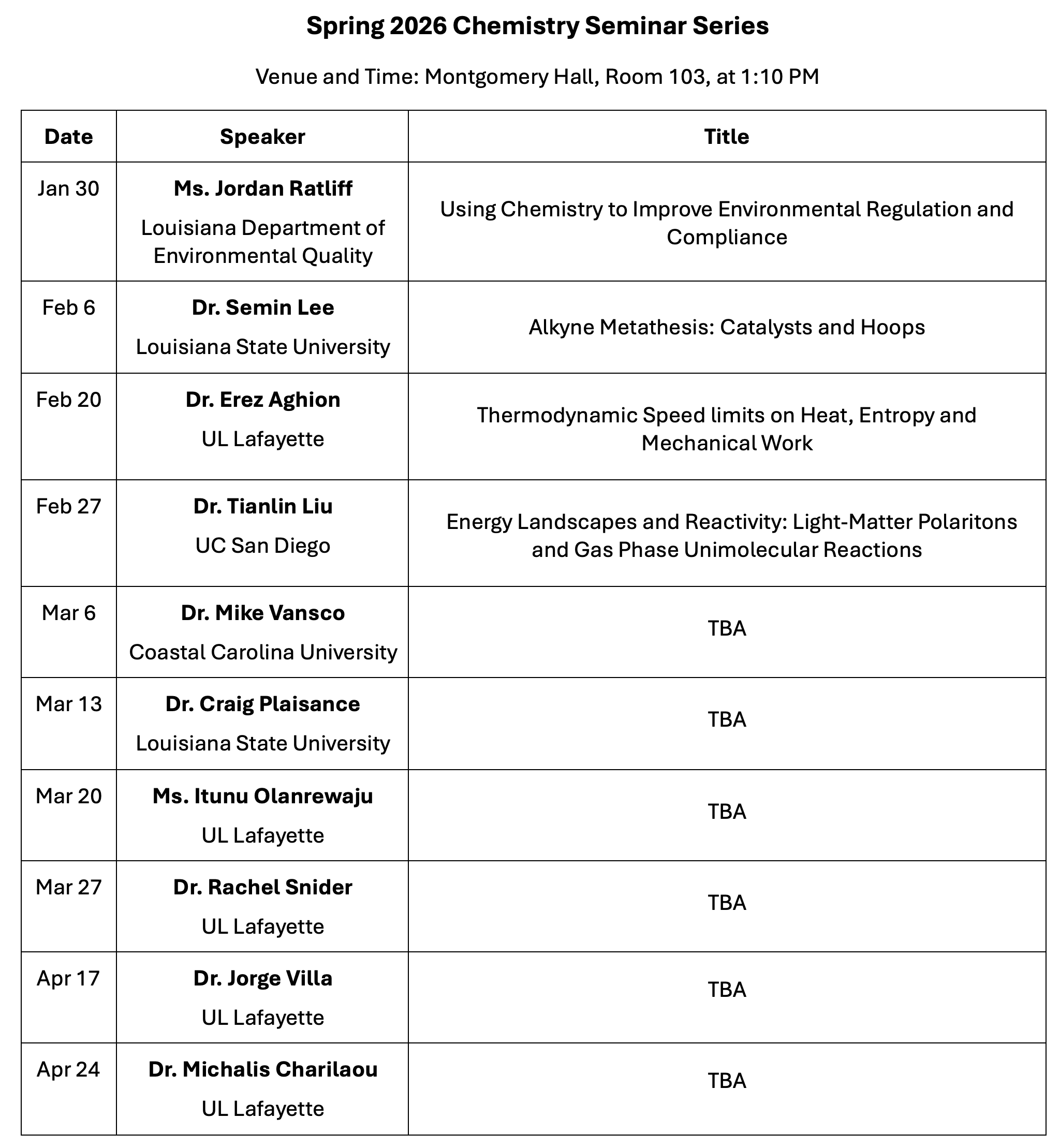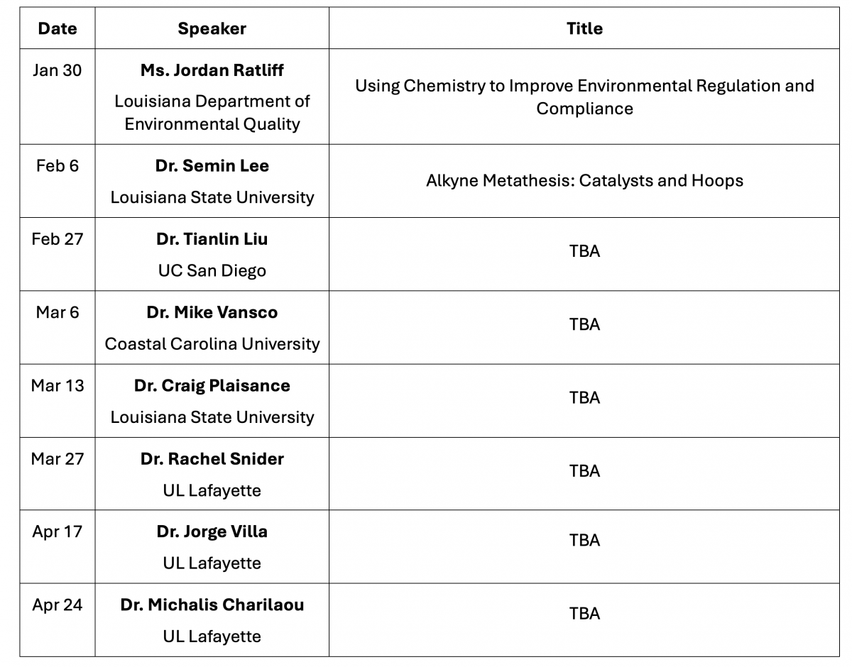 Spring 2026 Chemistry Seminar Series